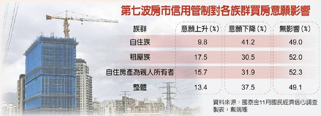 中央銀行在9月推出第七波房市信用管制措施,房市交易量急縮,掀起一波「金龍海嘯」,但根據國泰金控20日新公布的11月「國民經濟信心調查」,近6成民眾仍認為未來半年房價會漲逾3%,僅12%認為房價跌幅會超過3%,但有近4成因央行加重打炒房降低買房意願。