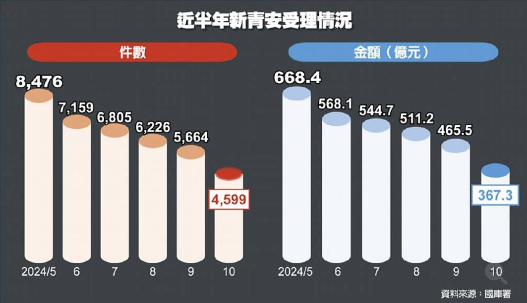 對照10月新青安申貸戶數4,599戶、金額367.34億元,戶數減少了3,877戶、金額則少了301.06億元,減幅都逾45%,等於已接近對半砍。