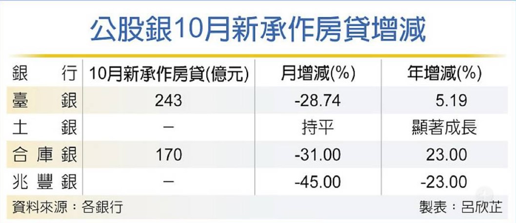 合庫銀說明,10月新承作房貸金額約170億元、月減31%,主要因案件審核期拉長,撥貸金額減少所致;土銀因不受《銀行法》第72條之2限制,僅就相關授信比例設有內部管控目標,10月新增房貸與9月相當。
