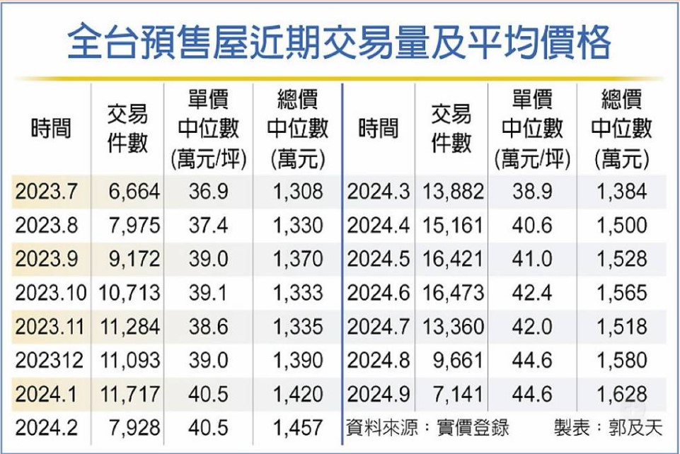 即使房貸緊縮加上央行信用管制等打房政策,使預售市場交易量大幅萎縮,6至9月交易件數連三個月減少,已較高檔時買氣腰斬,不過預售屋價格仍持續飆高,9月全台預售屋總價中位數首次突破1,600萬元大關,單價站上每坪44萬元,呈現「量縮價漲」的背離情形,業者預期,短期仍難見價格修正。