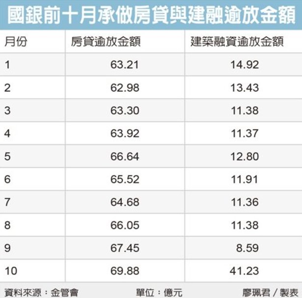 銀行局副局長侯立洋說,10月房貸逾放月增2.43億元到69.88億元,連三個月走揚,是因房貸量大,讓逾放略增,但逾放比仍維持0.06%史上新低,也尚無較大逾放的個案;另10月建融逾放月增32.6億元到41.23億元,是因有一筆建商餘屋貸款個案,9月違約,10月打入逾放。