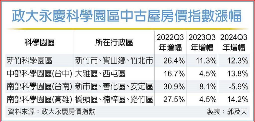 「政大永慶科學園區中古屋房價指數」顯示,新竹科學園區連續四年房價均有雙位數漲幅,漲勢持續兇猛,南部科學園區台南園區則在2021、2022年出現逾2成的強勁漲幅後,今年第三季首見下跌。