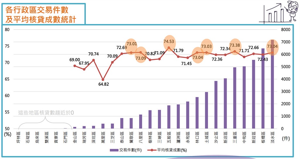 新北市平均核貸成數7成以上的有19個行政區,其中有7個行政區達到7成3,依序為五股74.53%、三重73.38%、八里73.09%、林口73.04%、淡水73.04%、土城73.03%及鶯歌73.01%。