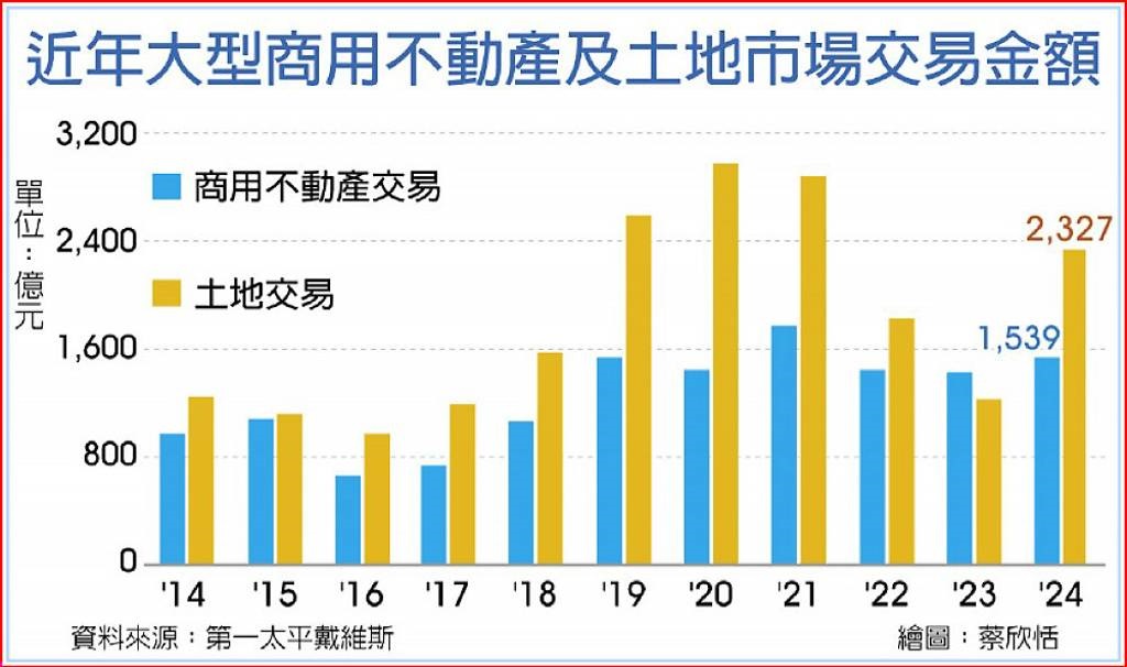 第一太平戴維斯發布2024年商用不動產市場報告指出,今年大型商用不動產交易達1,539億元、年增8%,為近十年次高,其中,科技業連續二年成為商用不動產的最大買方,今年全年投入金額達700億元。