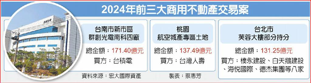 其中金額前三高的交易案都突破百億元,包括台積電砸171億元購入南科廠房,台壽保以137.49億元購買桃園航空城產專區土地,樸永及海悅等以131億元購買芙蓉大樓部分持分。
