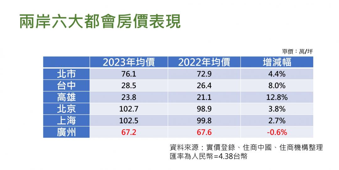 近期台灣房市屢創新高,相較之下中國表現相對弱勢,擁有兩岸最多店數的住商機構統計兩岸六大都會二手房房價後發現,高雄受惠於台積電等重大利多,加上本身房價基期低,以12.8%漲幅傲視各區域,北市與台中在高基期影響下,漲幅有限,而兩岸六大都會唯一下跌的僅有廣州,跌幅達0.6%,比起政經資源薈萃的北京與上海已經走出陰霾,房價穩定打底的狀況,表現相對弱勢。