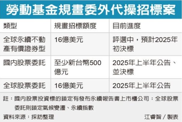 相關人士透露,2025年上半年至少500億元台股委外代操案,額度是2024年就有了,只是規畫採「相對報酬型」,惟要選擇盯住那一個股票型指數,一直無法定案,延至2025年上半年招標。勞動基金運用局規劃,台股投資標的都將會鎖定有編製永續報告書的上市櫃公司。