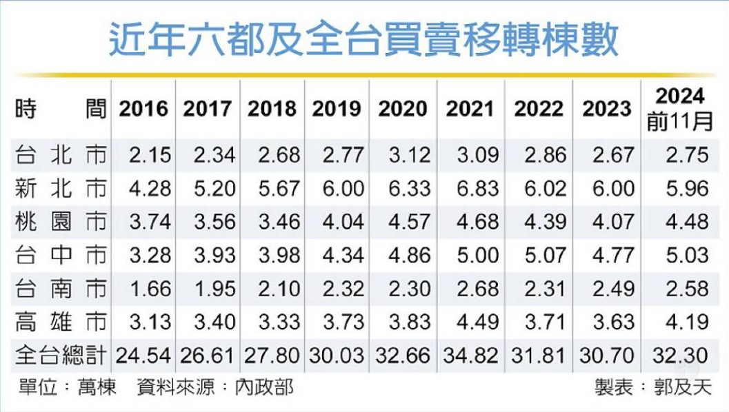 不過,在房貸拉警報前房市買氣熱絡,前八個月中有六個月單月移轉突破3萬棟,累計前11月已達32.3萬棟、年增17.1%,預估全年交易量將達34.5萬~35萬棟,繼2021年時全台交易量創下34.8萬棟高峰後,2024年交易量仍可望是近十年來最高或次高的水位。