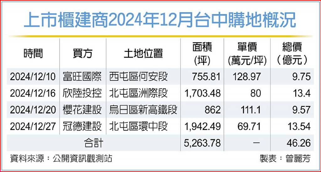 上市櫃建商2024年12月台中購地概況