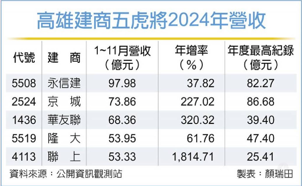 揮別龍年,高雄上市櫃建商除永信建設(5508)、華友聯(1436)、隆大(5519)、聯上(4113),2024年營收確定創新高之外,京城建設(2524)藉由11、12月連續二個月的新案交屋入帳,加入創高行列,高雄上市櫃建商五虎將2024年業績同創新猷。進入蛇年之後,永信建、京城將依靠成屋銷售持續貢獻營收。