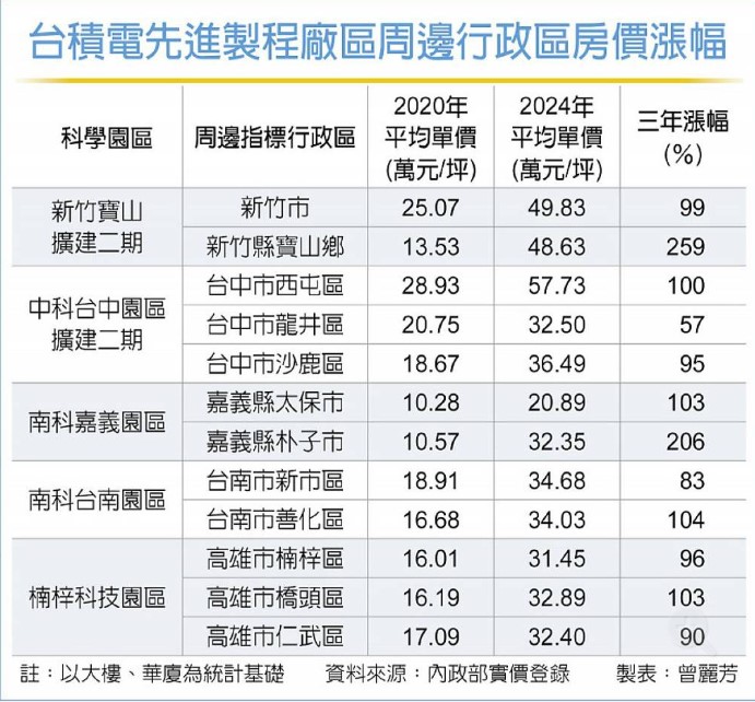 根據實價登錄資料,位於台積電2奈米生產基地的新竹寶山,近五年大樓、華廈平均單價漲幅達259%,就連新竹市區漲幅也有99%;同為2奈米生產基地的高雄楠梓產業園區,周邊行政區楠梓、橋頭區,同期房價漲幅分別達96%及103%,仁武區也上漲90%。