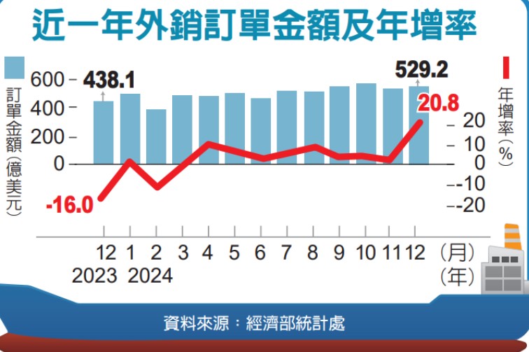 經濟部昨(21)日發布2024年12月外銷訂單529.2億美元,年增20.8%,優於預期,呈連十紅。經濟部表示,主因AI需求帶動,以及年前拉貨動能較預期強勁。2024全年外銷訂單5,895.4億美元,為歷年第三高,年增5.1%,結束連續二年負成長。