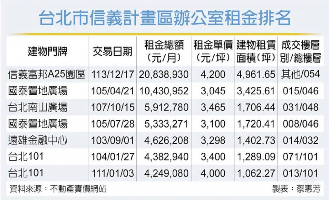 據台北市實價周報資料顯示,信義計畫區揭露一筆單月租金高達2,084萬元的辦公室租賃案件,信義富邦A25園區40~45樓與49、50樓,建物租賃面積近5,000坪,高樓層揭露每坪約4,200元,每月總租金2,084萬元,成交時間為去年12月,寫下信義計畫區辦公室實價租金的總價新高紀錄。