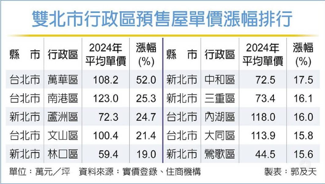 近年全台房價大漲,其中雙北市預售屋房價漲幅可觀。據實價登錄統計,雙北市去年各行政區預售屋房價漲幅,以北市萬華區高達52%居冠,其次為南港區25.3%、新北蘆洲區24.7%。值得注意的是,過去一、二年的蛋白區,如北市萬華、大同、文山等區僅最高價衝破百萬元,如今均價也達百萬元;隨房價持續高漲,台北市單價百萬元以內的預售屋恐將成絕響。