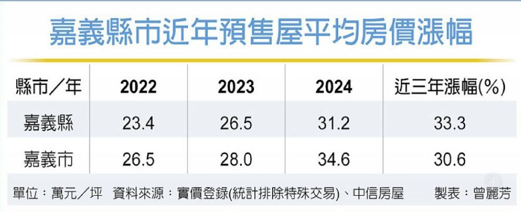 台積電進駐嘉義科學園區打造CoWoS先進封裝廠,讓當地房價漲到很有感。中信房屋研展室彙整實價登錄資料統計,2022至2024年這三年來,嘉義縣預售屋平均房價從每坪23.4萬元漲到31.2萬元,漲幅達33.3%;嘉義市預售屋的平均房價上漲也達30.6%。