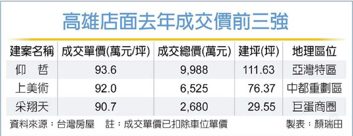 根據台灣房屋集團統計,高雄去年樓店成交單價排名第二名的是位於中都重劃區的「上美術」一樓店面,去年5月以每坪92萬元成交;排名第三的是巨蛋商圈的「采翔天」一樓店面,,去年9月以每坪90.7萬元成交。