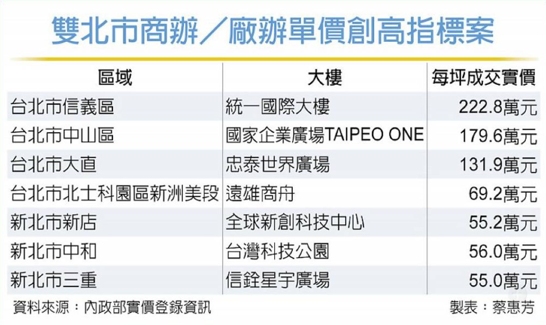 至於全台最高辦公單價,仍是信義計畫區的統一國際大樓,短短2年就出現兩次每坪200萬元以上成交紀錄,一次是2022年保力達以每坪211萬元買下,一次是2025年初太子建設以每坪222.8萬元買下27樓辦公室,再度改寫台北市及全台灣A辦的新高紀錄。