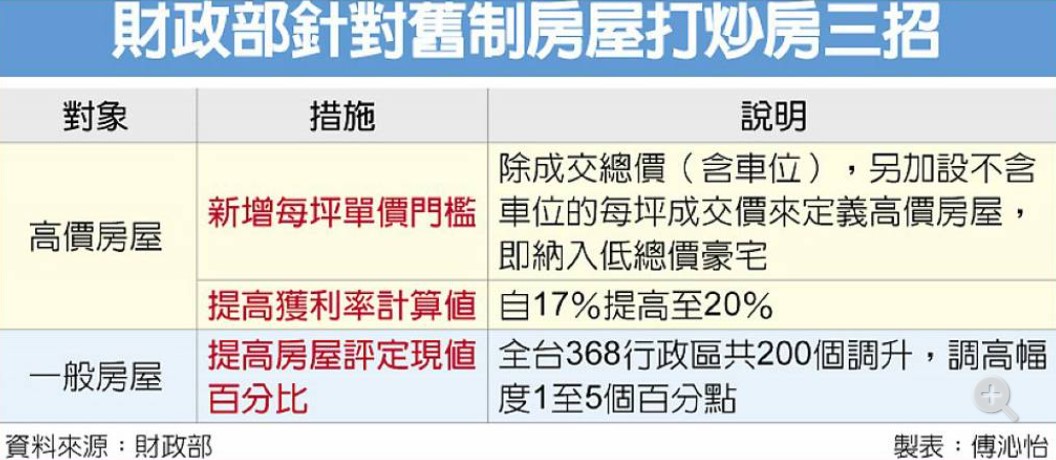 財政部打炒房再出新招。針對個人出售2015年12月31日房地合一稅上路前,所取得的舊制房屋,財政部19日宣布三大措施,除調高設算所得額標準1到5個百分點、豪宅獲利率自17%調高到20%,並新納低總價、高單價的小豪宅入列。