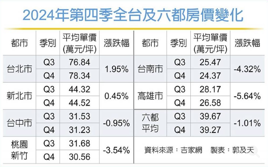 漲了多年的房價去年第四季起,空方氣勢轉強,據吉家網公布去年第四季季報顯示,六都房價平均季跌1.01%,其中北二都抗跌、南二都領跌,台南與高雄各大行政區房價幾乎全軍覆沒,凸顯台積電外溢效應超漲區的房價率先下修,「台積宅」暫時失靈,台中沙鹿、台南新化、高雄岡山、新竹竹北季減幅均逾11%,跌幅高居全台前四名。