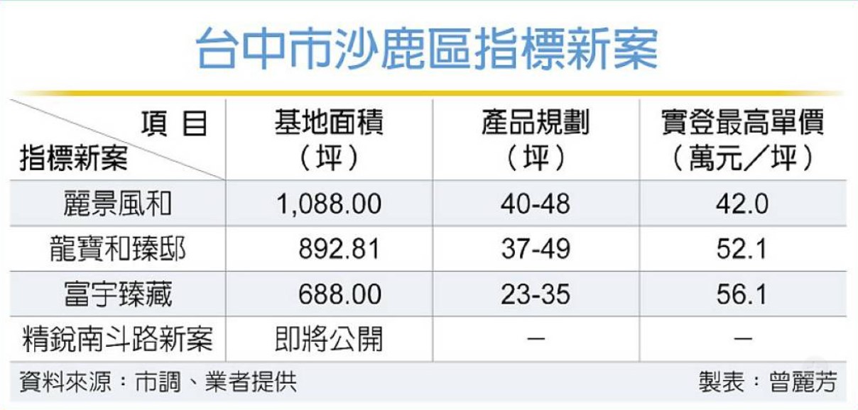 龍寶建設首度進軍沙鹿區推出合建案「和臻邸」,規劃37至49坪的三至四房產品,總戶數僅52戶,實登揭露最高成交單價達52.1萬元;鄰近捷運藍線B4沙鹿站的「富宇臻藏」,實登揭露單價56.14萬元,刷新區域成交單價;繼「精銳錦」之後,精銳建設看準海線區的發展潛力,近期將在沙鹿區推出「南斗路新案」。