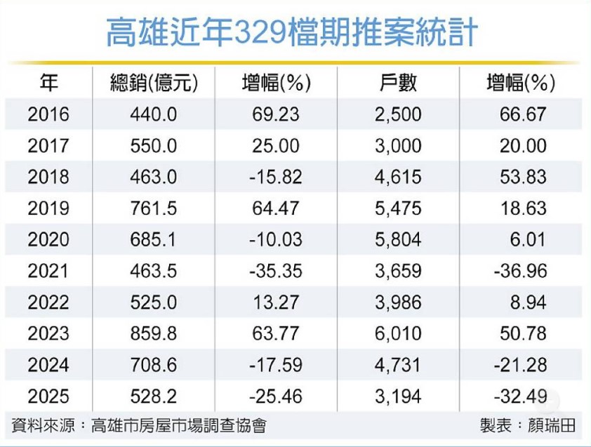政策打房持續發威,高雄房市因建商、買盤觀氣氛濃厚,今年329檔期「有點冷」,推案總銷528.2億元、年減25.46%,推案總戶數3,194戶、年減32.49%。高雄市房屋市場調查協會理事長吳曜廷表示,「目前看不到未來」,但因高雄科技轉型及招商引資成功,高雄房市長期看多。