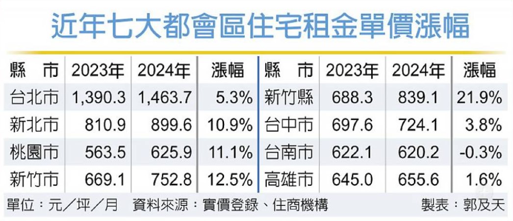 台北市去年平均租金達每坪1,463元、新北市逼近每坪900元,相當於在台北、新北租一間30坪房屋,月租金約4.3萬元、2.7萬元,過去租金水準多在每坪500、600元左右的雙北以外都會區,新竹、台中都已超過每坪700元。