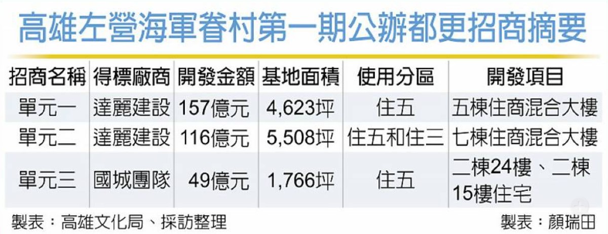 高雄文化局18日指出,左營海軍眷村第一期公辦都更,得標廠商三個單元的投資金額共達322億元,其中達麗建設單元一將投資157億元,同樣也是達麗得標的單元二投資金額約116億元,國城建設和高興昌團隊的單元三投資金額約49億元。
