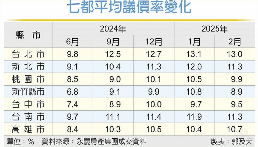 永慶調查顯示,與去年6、7月間相較,新竹目前成交議價率增加4個百分點,台北、新北分別增加3.7、3.1個百分點,其餘各都均增加2~3個百分點,議價率正明顯擴大中,且只要議價率在12%以上,即帶動交易量占比增長超過3成,顯示降價促動成交機率大增。
