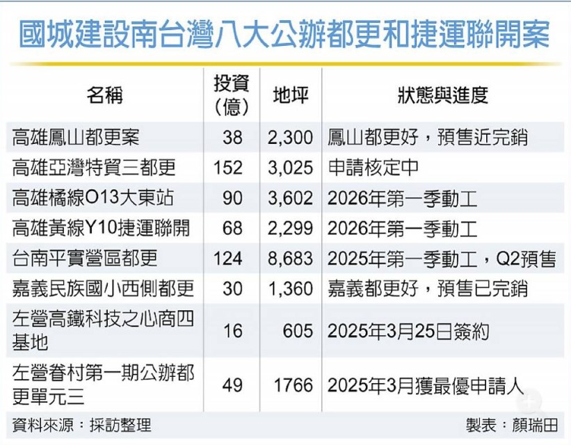 左營高鐵科技之心公辦都更案「商四基地」,國城建設總裁洪平森與高雄副市長林欽榮25日簽約,林欽榮表示,包括此案在內,國城集團在南台灣總共標得八大公辦都更、捷運聯合開發案,總投資額達567億元,可說是南台灣公辦都更和捷運聯開天王。