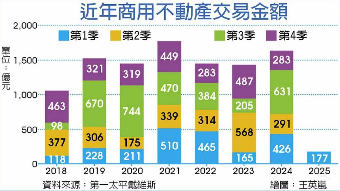 中央銀行第七波不動產信用管制政策後座力,衝擊商用不動產市場買方信心。第一太平戴維斯統計,2025年第一季商用不動產市場成交金額僅177億元,年減58%、季減38%,創下近五年同期次低紀錄。