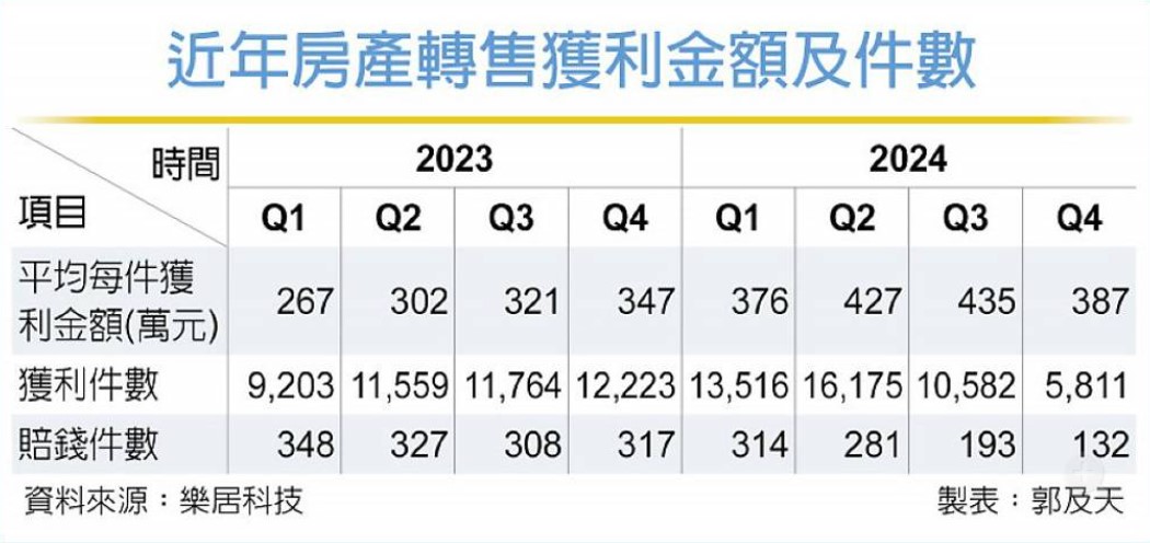 樂居網統計顯示,自2016年房地合一稅實施以來自2020年間,平均每件房產轉售獲利約在40萬~70萬元,而2020年起,隨著房價快速上漲,平均轉售獲利金額也跟著快速提高,2020年第四季突破百萬元,2022年第一季突跛200萬元,2023年第二季突破300萬元,直至去年第三季更高達435萬元,隨買方信心轉趨保守、追價不再,第四季則出現近五年來首次下滑。