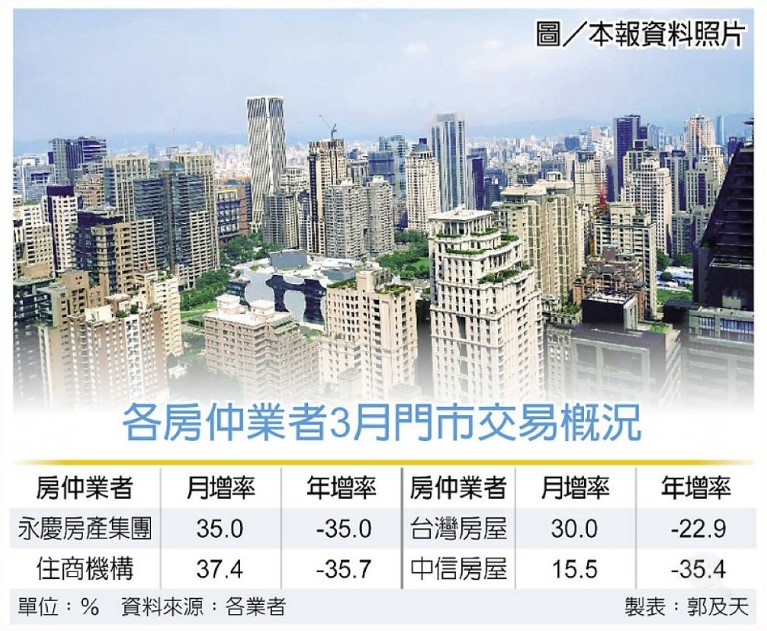 據各房仲業者自結3月門市交易量顯示,永慶房產集團月增35%,住商機構月增37.4%,台灣房屋月增30%,中信房屋月增15.5%,不過與去年房市景氣熱絡時相較仍減少23%~36%。