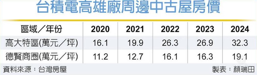 台積電設廠所到之處,周邊商圈房價漲翻天,高雄廠區周邊的楠梓高大特區、德賢商圈等兩大熱門購屋區,中古屋大樓房價全部上揚,其中高大特區漲勢最驚人,中古屋房價從2020年每坪均價16.1萬元,去年飆升至32.3萬元,五年漲幅翻倍,新屋預售單價上看5字頭。