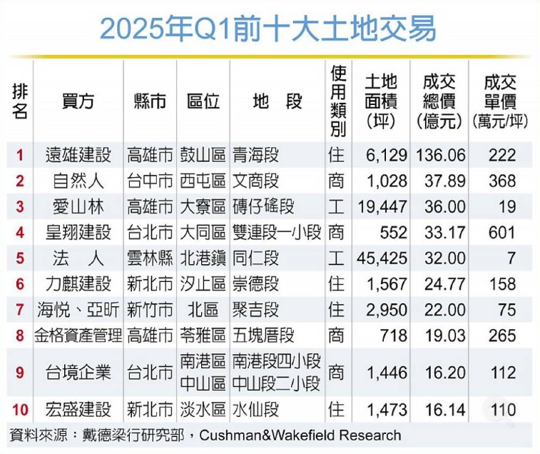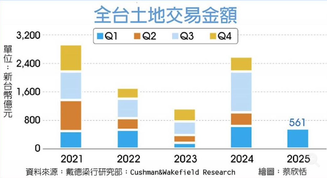 戴德梁行1日公布今年第一季土地市場成交金額,在建商大舉購地下,單季達561億元,戴德梁行表示,儘管中央銀行的選擇性信用管制尚無鬆綁跡象,但建商持續購地的態勢,並未因房市交易低迷而停手,首季成交量維持在近五年單季均量的高水準,並超越近十年單季均量,且排名前五大土地交易案金額均跨越30億元門檻,為歷年罕見。
