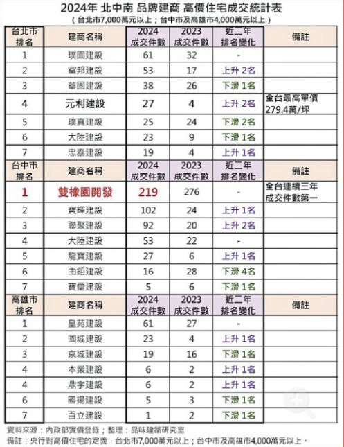 2024年全台高價住宅成交榜單出爐,富邦建設、雙橡園開發、皇苑建設分別奪得北中南年度「豪宅王」桂冠;其中雙橡園開發,以219筆成交件數穩居全台之冠,奪得「三連霸」,也是聯聚、寶輝、寶璽、龍寶、由鉅、雙橡園開發、大陸「一聯三寶由雙陸」七大頂級品牌建商之冠。