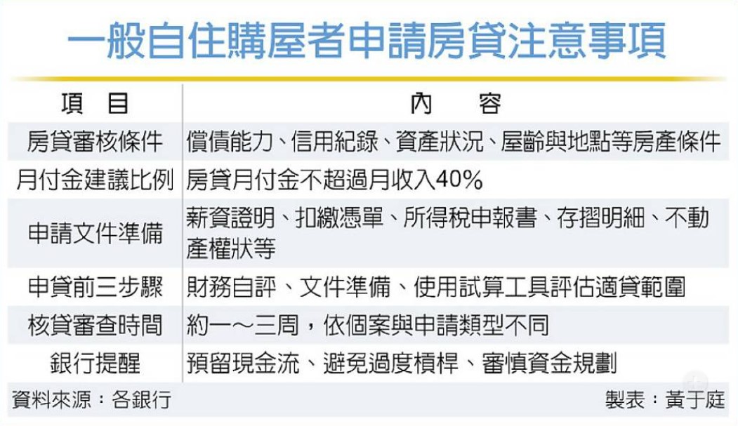 銀行業者建議,在審核房貸申請時,會依據借款人條件、貸款用途和房產條件來評估,如薪資證明、扣繳憑單或所得稅申報書,確保有穩定收入可支付貸款,以及房貸、車貸、信用卡債務等總負債不得超過月收入的一定比例;貸款用途若為自住較易核貸,若為投資、出租或公司用途,可能需提供額外財務資料,且利率可能較高。