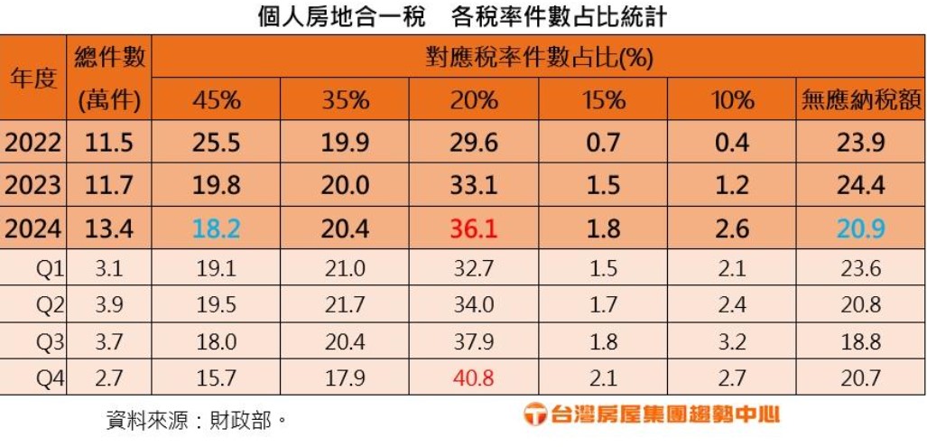 值得一提的是,除了持有2年內轉售交易的45%稅率案件占比走低外,去年免稅案件的占比也創下歷年新低,僅約2成的案件免稅。