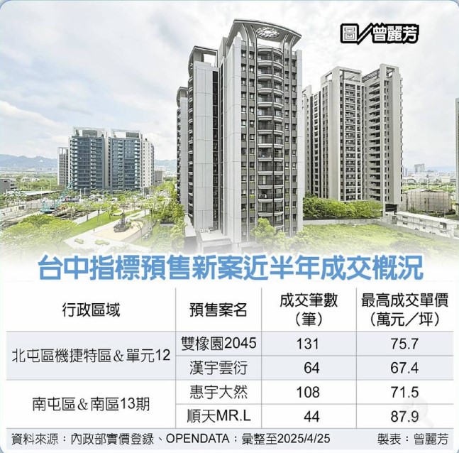 生活機能完整且有捷運綠線經過的南台中,近期13期南區與南屯區預售新案表現亮眼,其中「惠宇大然」實登已揭露108筆成交案,最高成交單價71.5萬元;南屯區「順天MR.L」目前揭露44筆成交,最高單價達87.9萬元,刷新區域單價新高。