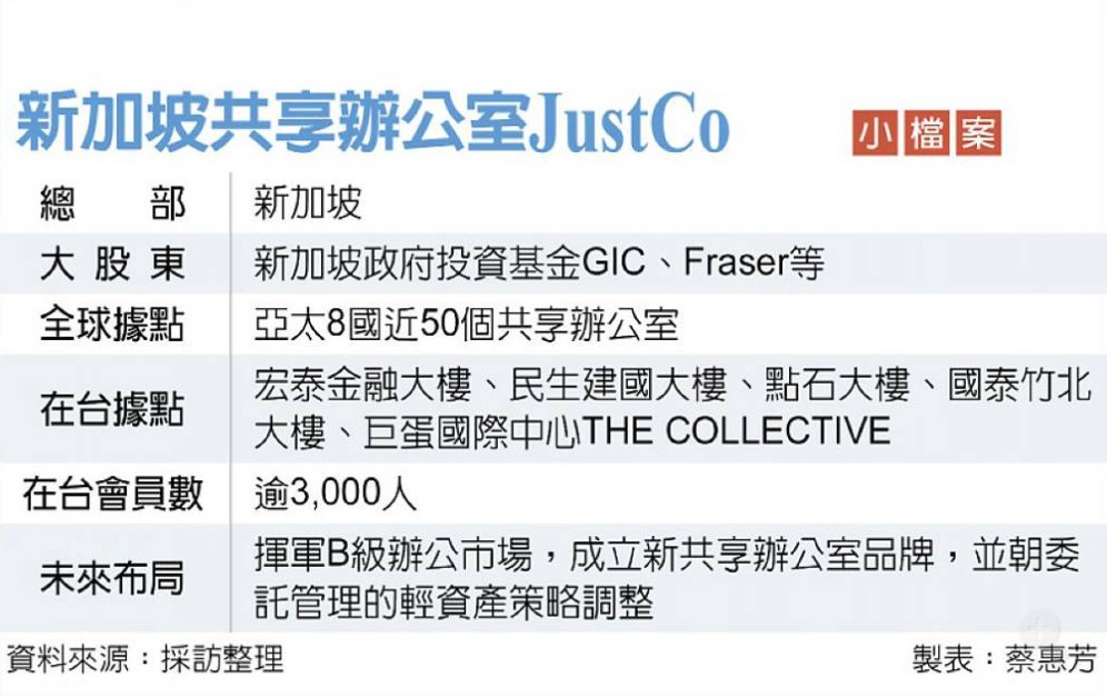JustCo創辦人兼執行長龔萬鑫表示,JustCo在2011年創辦於新加坡,2017年獲新加坡政府投資基金GIC、Fraser集團注資,大舉拓展亞洲據點,目前在全球設有47個共享辦公室據點。