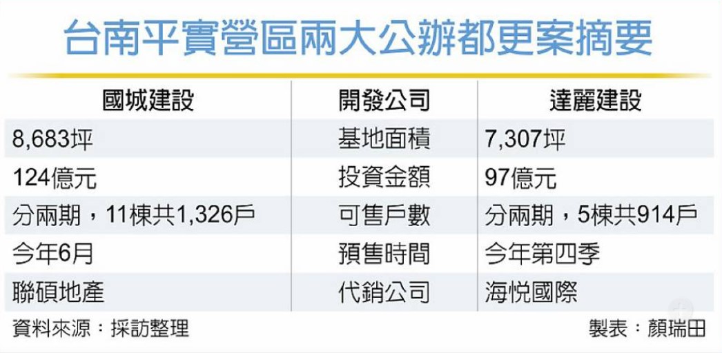 南台灣公辦都更火熱推進,除高雄特貿三,台南平實營區的兩大都更案,預計吸引投資金額至少221億元,其中,國城建設8,683坪基地預定6月委由聯碩地產預售,達麗的7,307坪基地則規畫今年底進場,交由海悅代銷。市場預估未來兩大都更案開賣後,每坪開價將從5字頭起跳,上看6字頭。