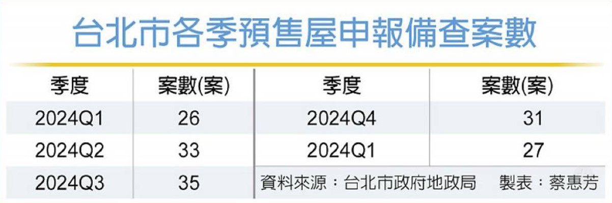 根據北市地政局最新統計顯示,首季北市預售建案申報備查量共計27案,季減12.9%、年增3.85%。
