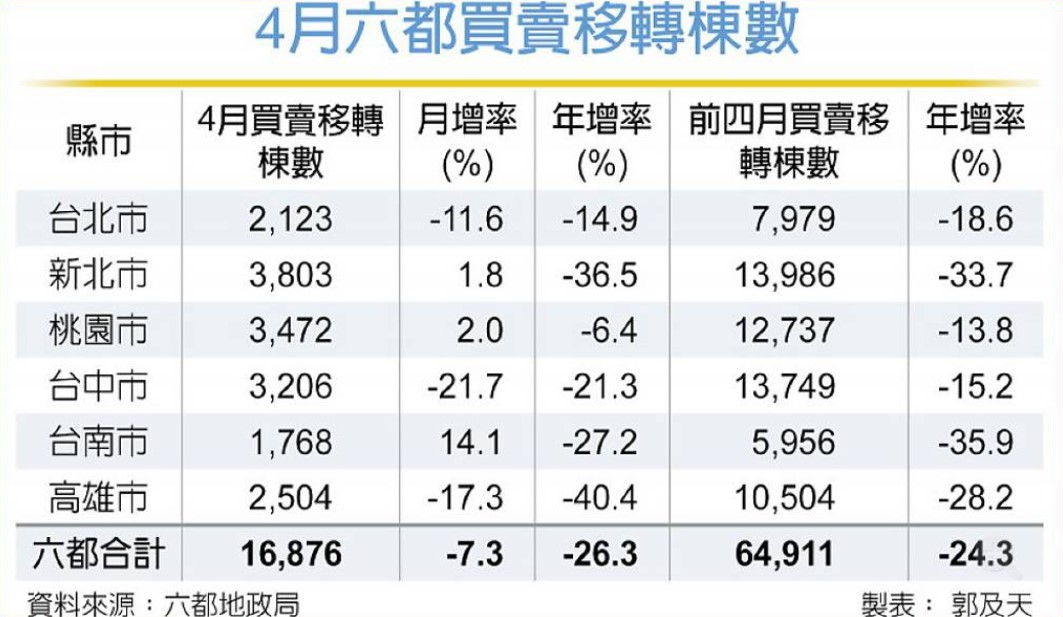 今年前四月六都買賣移轉6.49萬棟、年減24.3%,近七年同期新低,其中新北、台南年減幅均達3成以上,高雄達28%,台南與高雄創下近八年同期新低,新北則是近九年同期最低交易量。