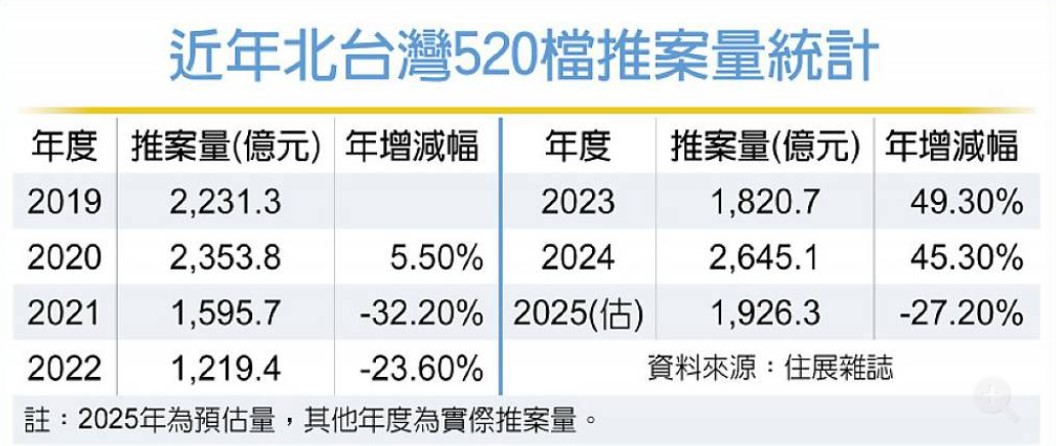 住展雜誌發言人陳炳辰指出,觀察近幾年520檔期,2020年的史上大降息,與2019、2024年的台股大幅飆高,讓建商推案量動輒突破2,000億元大關;但2021到2023年及去年9月,都有政策干擾,加上銀行房貸放款緊縮,建商推案信心明顯受影響。