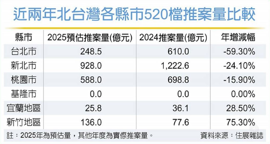今年520檔期推案量減幅最明顯的台北市,推案攻勢熄火,估計有248.5億元新案登場,年減幅59.3%。較具指標的新案為大同區總銷50億元的「毅聯涼州街案」。新北市比去年減少24.1%,推案量928億元,其中總銷100億元以上有三筆,包括中和的水岸宅「左岸明珠」、新店央北重劃區的「寶鈺」、三重二重重劃區「甲山林市政帝寶」,突圍房市冷氣團。