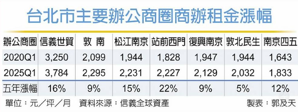 企業對商辦需求強勁,加上不少新建商辦完工,北市商辦租金持續走揚,據信義全球資產統計,台北市首季商辦平均租金2,672元,五年來漲幅約15%,除了信義世貿商圈最高租金突破每坪5,000元,包括復興南京、松江南京、站前西門、敦北民生、敦南等商圈屋齡較新或新建的A辦,最高租金逾每坪3,000元。