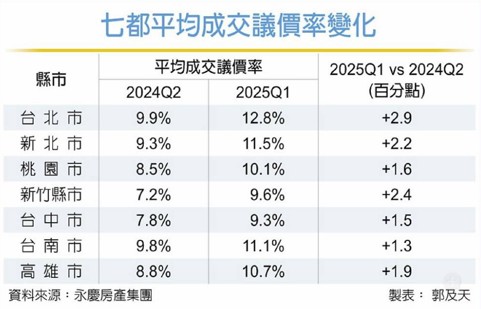統計顯示,七都第一季成交議價率以台北市的12.8%最高,期次為新北市的11.5%,僅新竹、台中在10%以下。成交議價率指房屋交易中開價與實際成交價之間的落差,也意味著買方在交易過程中能成功爭取的議價空間,及賣方對於價格讓步的幅度。