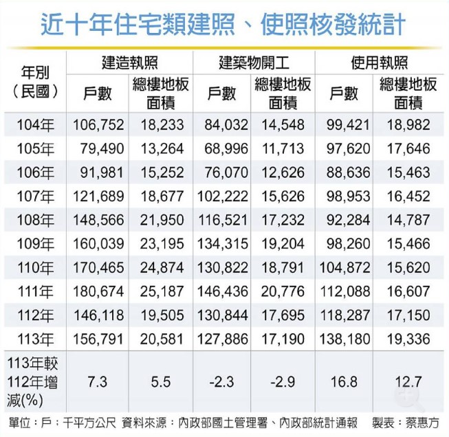 內政部統計通報最新數據顯示,去年核發住宅類建築物建造執照核發戶數計15.7萬戶、年增7.3%;使用執照達13.8萬戶、年增16.8%;申報開工戶數12.8萬戶、年減2.3%。