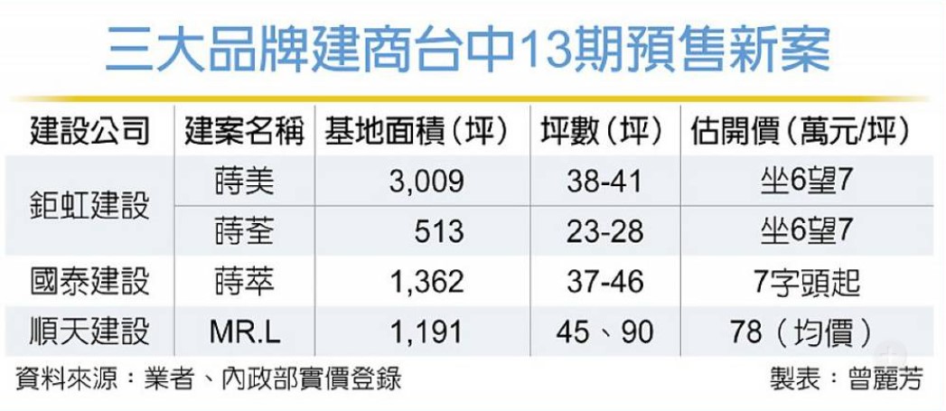 在13期與周邊手握逾2萬坪土地的鉅虹建設,第二季在昌明段推「蒔荃」與「蒔美」預售新案,「蒔荃」主打兩房23~28坪、「蒔美」三房38~41坪,總銷合計達百億元。4月底正式開案,每周平均吸引近百組預約賞屋。