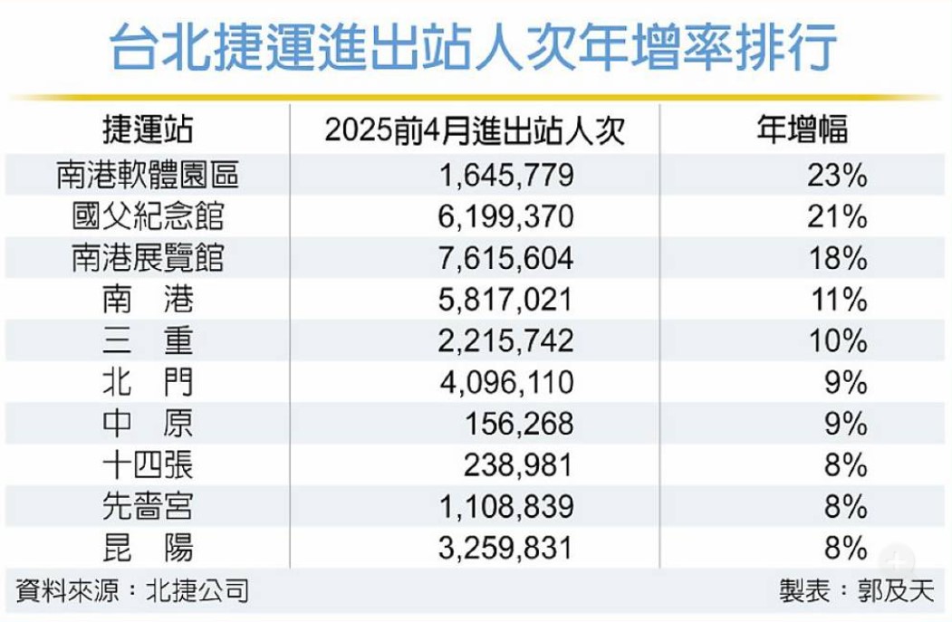 統計顯示,今年前四月除南港軟體園區站進出站人次年增21%,增幅居北捷各站第一外,南港展覽館站年增18%排名第三、南港站年增11%第四、昆陽站年增8%排第十。陳傑鳴表示,台北首間LaLaport在南港今年3月下旬開幕,如今已成為北市人潮與討論話題度最高的新商場,周邊各捷運站前四月進出人次年增加超過200萬人次,周邊商機成長相當巨大。