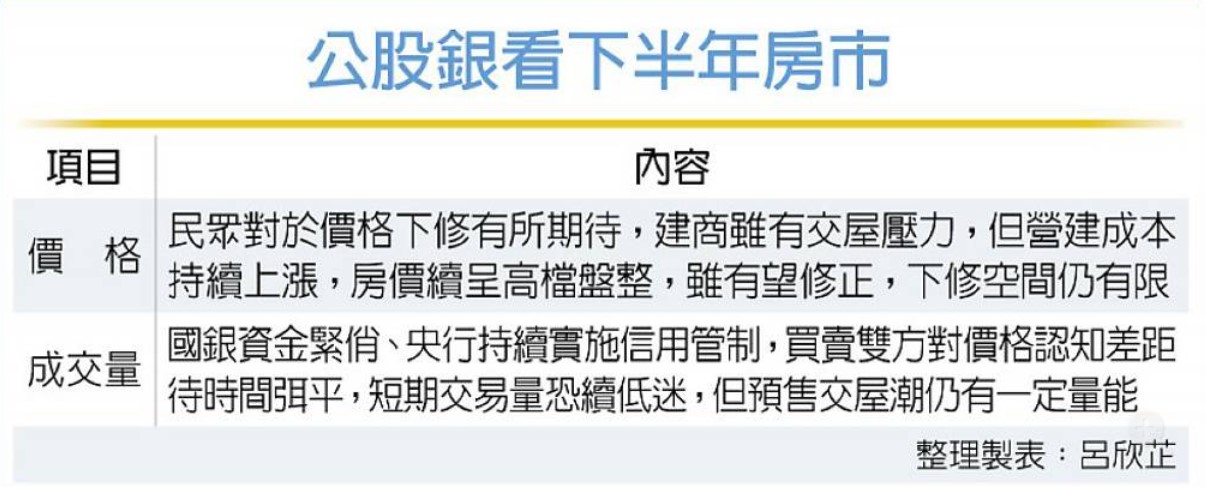 土銀認為,民眾追價意願降低,加上前幾年建商預售推案量大,目前進入完工階段,市場供給壓力將上升,但在營建成本作為支撐下,價格要明顯回落機率低,買賣雙方認知差距尚待時間弭平,市場交易量能將持續疲弱,預期房市將呈價盤整量縮格局。